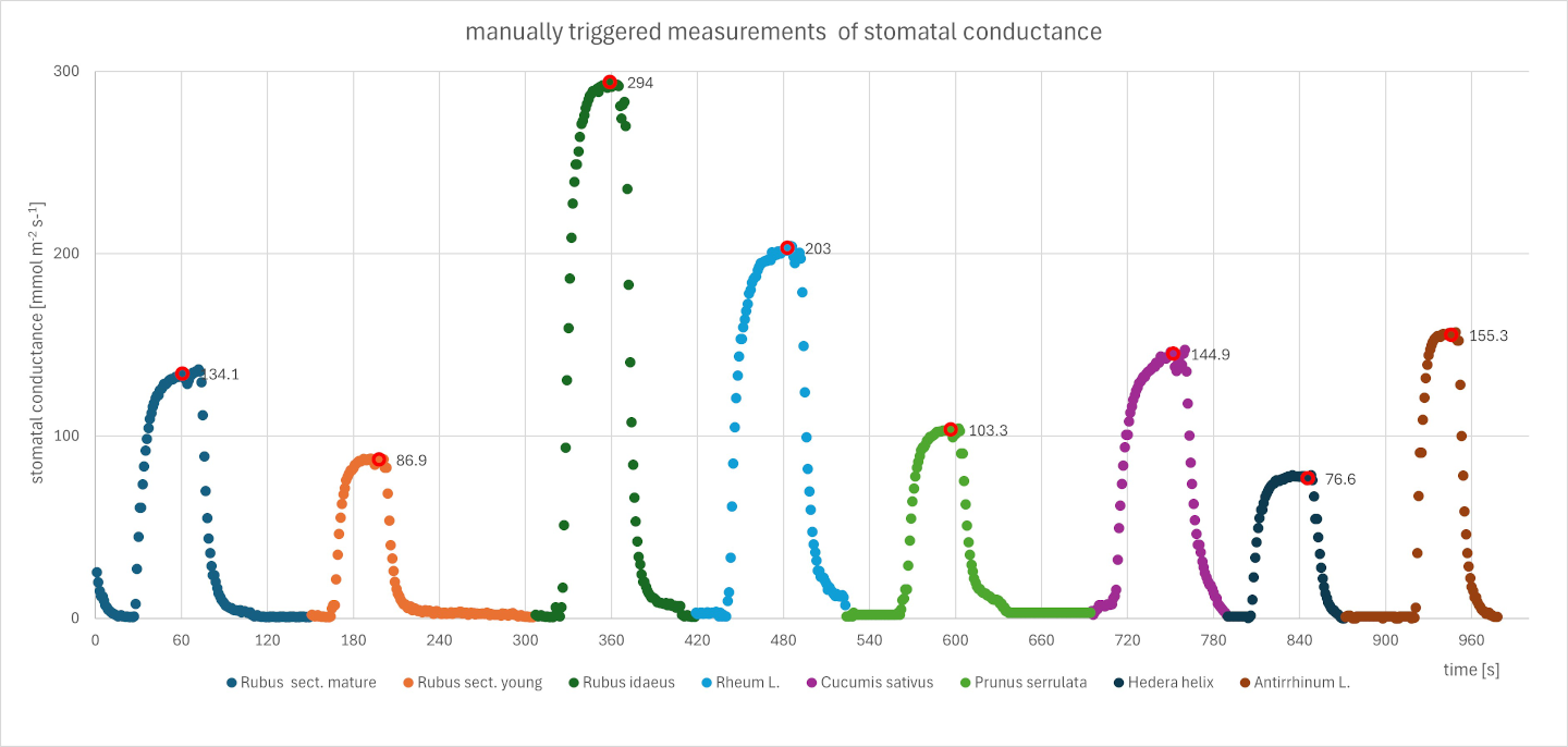 The MINI-PAM-II/POROMETER provides information on e.g. evaporation rate, VPD and stomatal conductance of the measured leaves. Measurements are easy to perform and provide accurate results within a typical sample measurement time of 15-30 seconds. To show typical measuring sequence, the datapoints were recorded every second using the WinControl-3 software. The dot circled in red marks a manual measurement triggering an additional saturation pulse analysis.