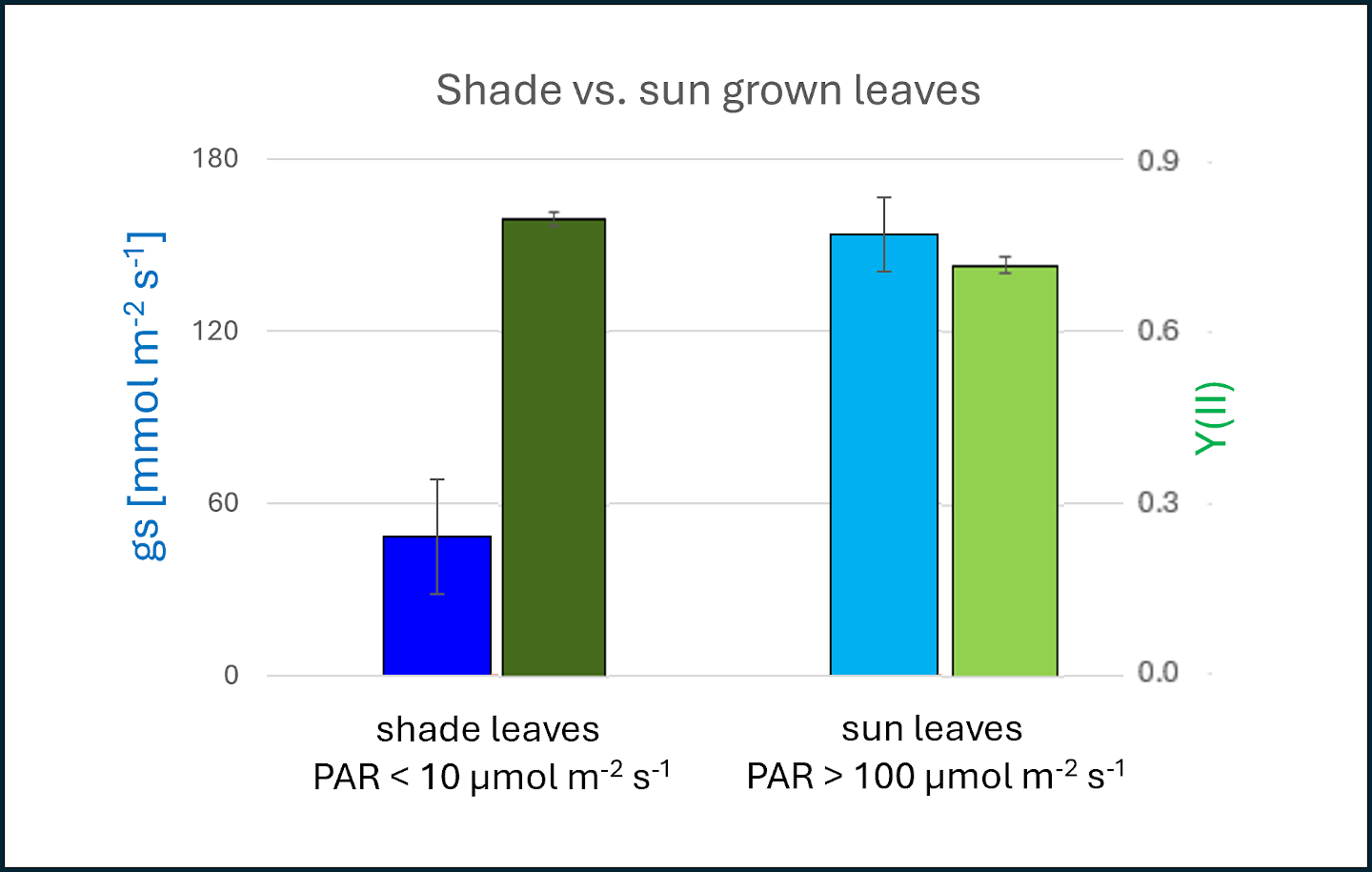 These differently grown leaves show many differences in parameter of porometer and chlorophyll fluorescence analysis. The figure shows as an example the results of stomatal conductance (gs) and Y(II). Particularly interesting for field measurements: the Porometer logs GPS, leaf solid angle of the surface normal and the incident vector of sunlight with each dataset so that the sample´s geographical context can be documented precisely.