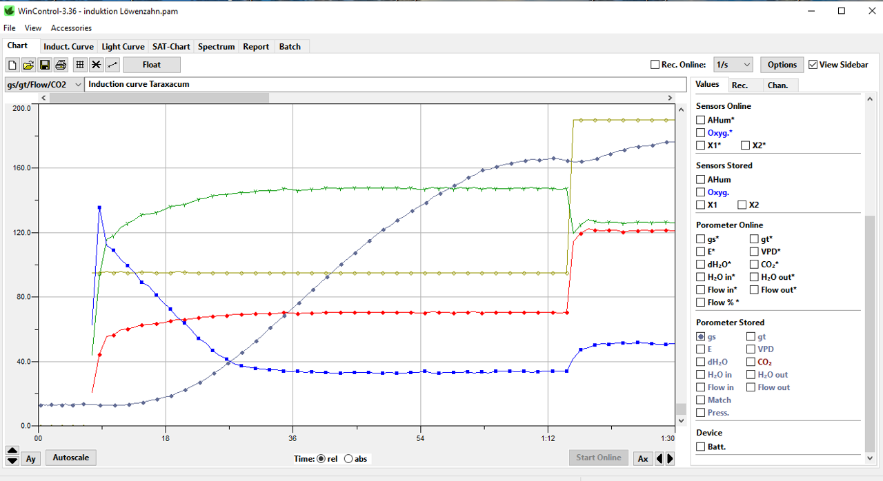 The MINI-PAM-II/POROMETER offers even more. This porometer allows MINI-PAM-II protocols to be combined with porometer data, adding an important aspect of gas exchange to these established tools for chlorophyll fluorescence analysis. This facilitates the measurement of evaporation, VPD, stomatal conductance and stomatal movement e.g. during light curves or induction curves. The figure shows stomal movement during an induction curve measured on a Taraxacum leaf.
