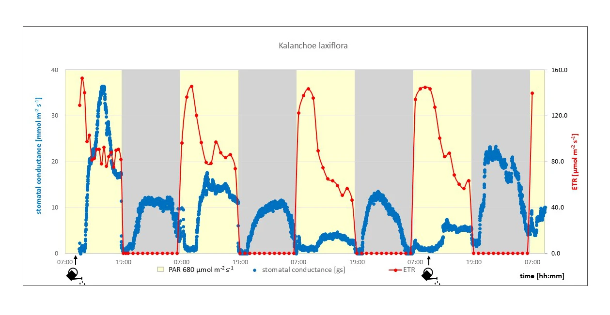 The plant was cultivated under a 12-hour light (680 µmol m⁻² s⁻¹) and 12-hour dark cycle. As is typical for CAM plants, the porometer determines stomatal opening at night. As long as the plant was adequately watered, stomatal opening also occurred during the second half of the day e.g. to maintain photosynthetic efficiency. Initially well-watered, the data clearly show a decline in stomatal aperture during the second half of the day over the first three days. Following irrigation on the fourth day, there is a marked increase in nocturnal stomatal opening compared to the previous three nights.