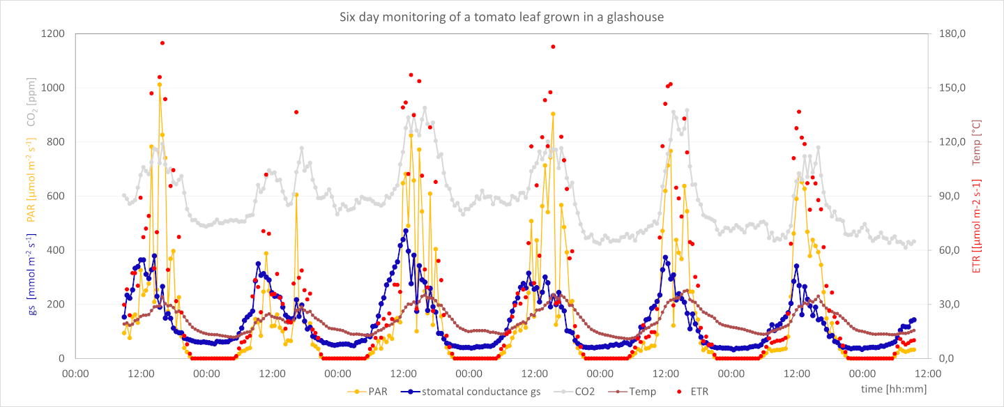 In this experiment the instrument executed porometer and chlorophyll fluorescence measurements every half hour for monitoring a tomato leaf continuously for six days inside a small greenhouse. The figure displays some of the comprehensive data collected during this period. Daily cycles were well measured, and you can see the performance of the leaf under the fluctuating light conditions throughout the day.
