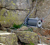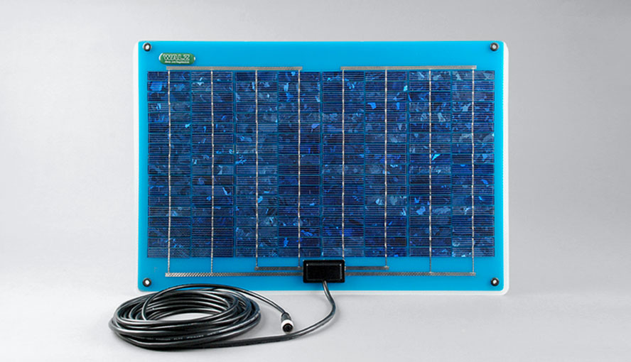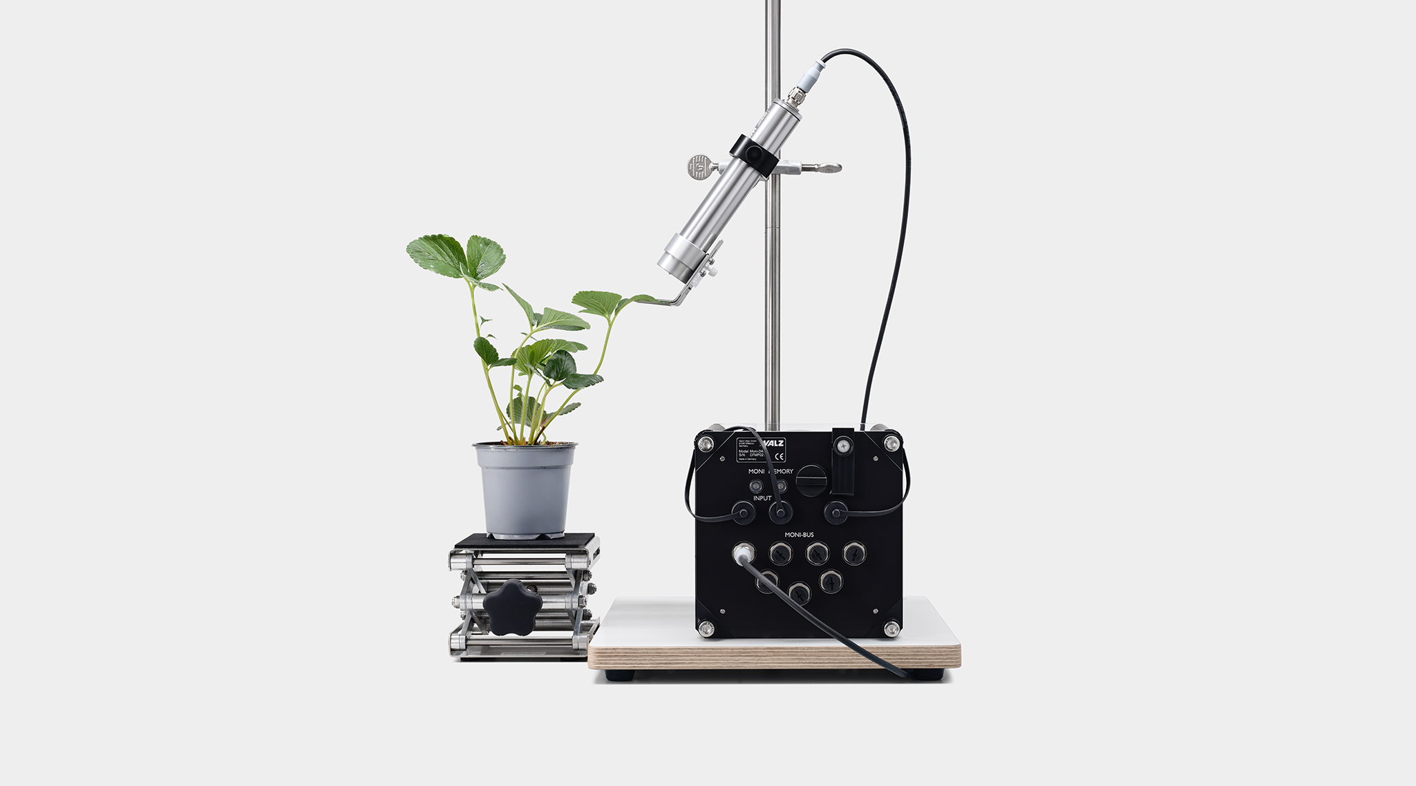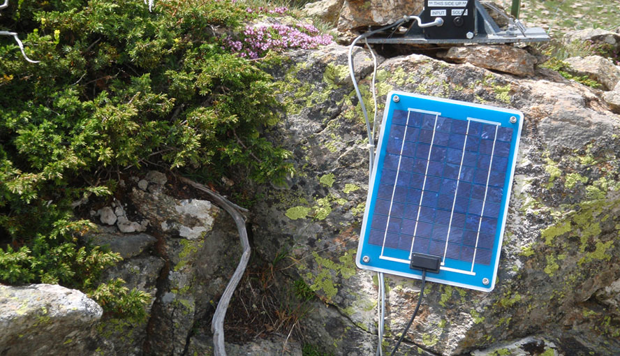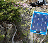 The STAND-ALONE configuration of the TERRESTRIAL version of the MONITORING-PAM is suited for independent long-term monitoring of photosynthesis at remote places in the absence of power supply. The system consists of the battery-powered data acquisition system MONI-DA, two solar panels MONI-SP and up to seven emitter-detector heads MONI-HEAD/485. The number of MONI-HEAD/485 heads per MONI-DA can be increased by the use of a MICRO-HUB interface.