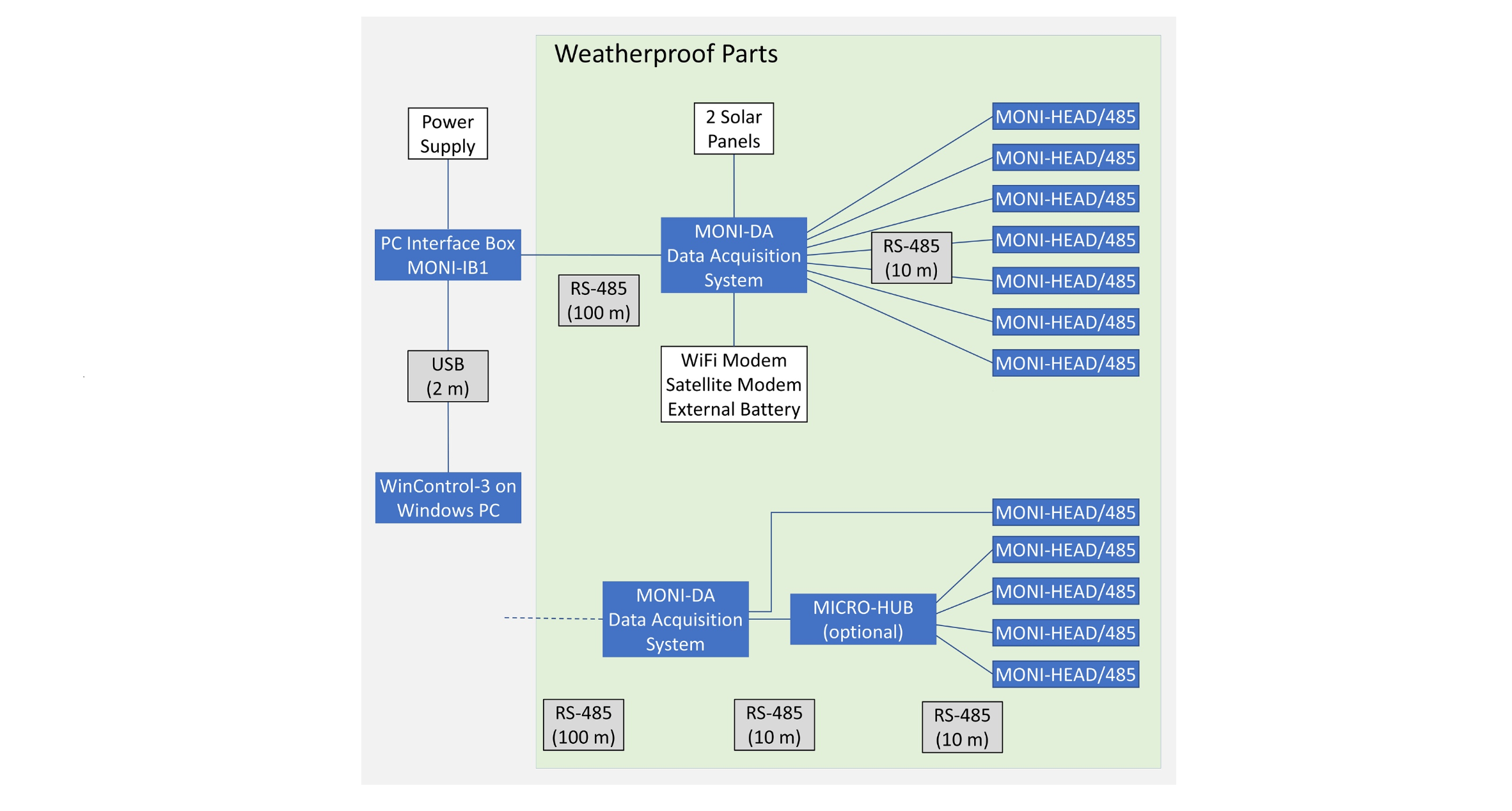 The MONI-DA logs data on a microSD flash card and, additionally, on an 8 MByte ring buffer. Online connection between MONI-DA and a Windows computer is established using the interface MONI-IB1 and USB communication. A WiFi or satellite modem transmits data to distant computers with little time delay.
